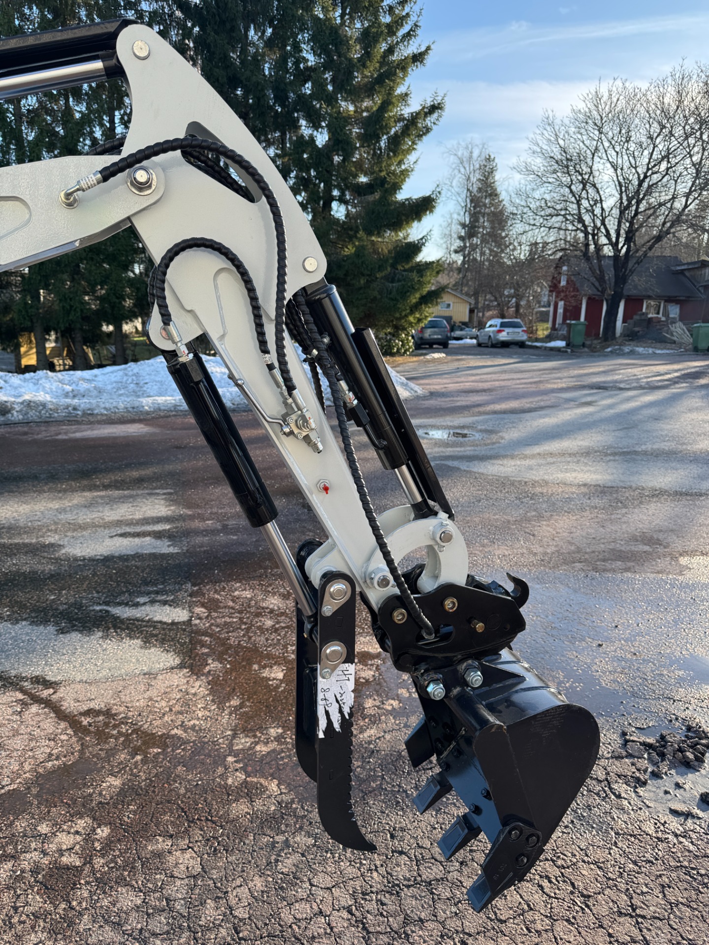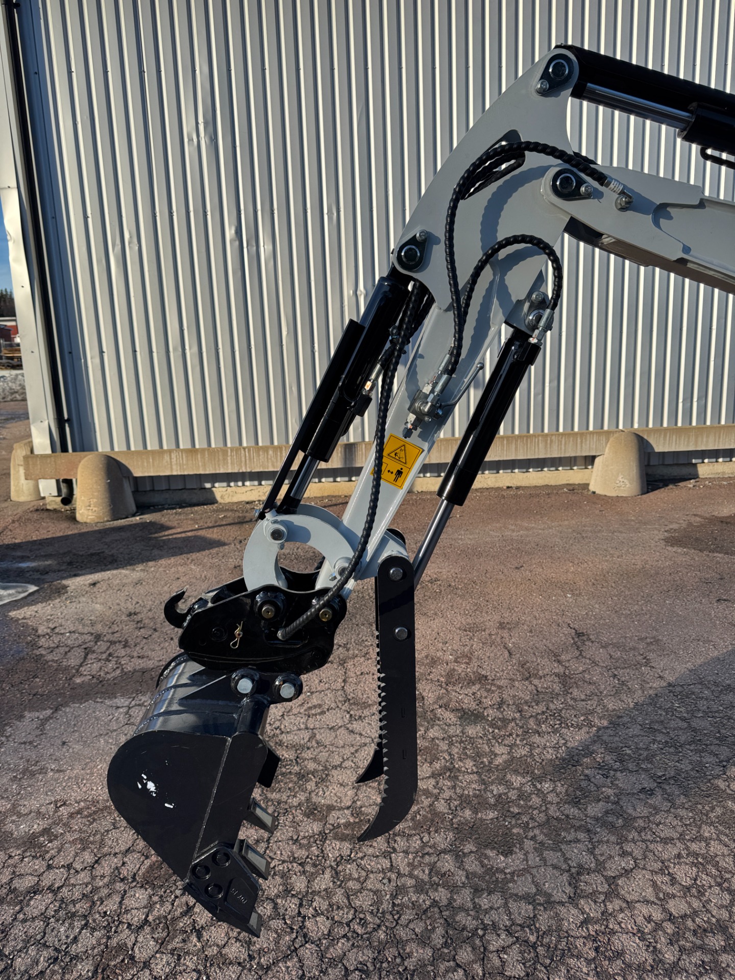 Hydrauliskt gripverktyg (tumme på stickan) som går långt ner. Praktisk när man ska plocka sten, stockar eller ris.