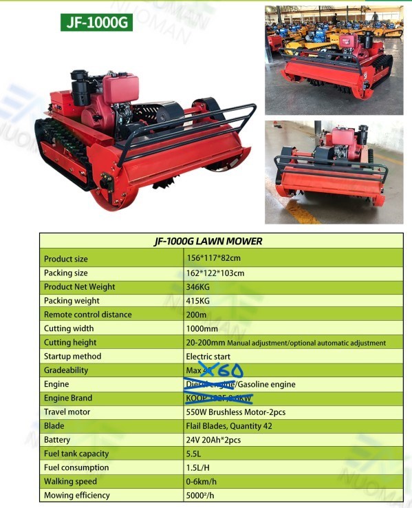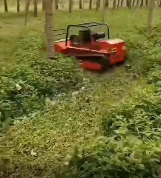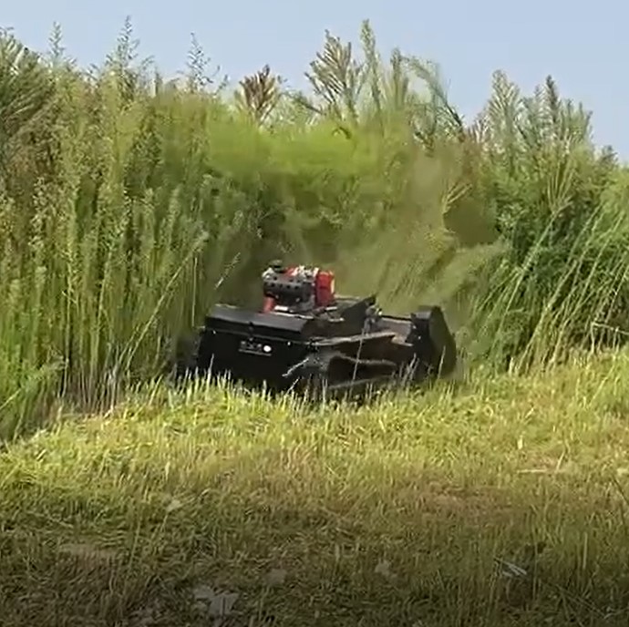 Radiostyrd släntklippare (slaghack, Y-järn, se foto). Klippbredd 1 meter. Loncin motor, encylindrig luftkyld bensin motor på 18hp. 400 meters räckvidd på radiokontrollenheten. Se mer teknisk data under fotografierna.